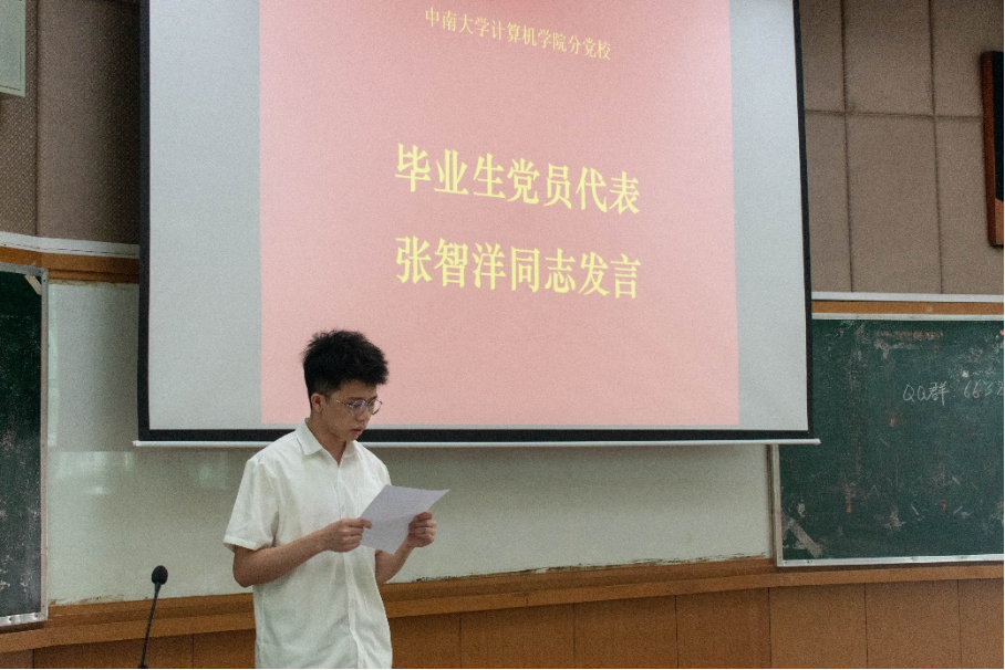 议程第三项,毕业生党员代表张智洋同志发言。他讲述了自己的入党经历,从员工工作、党员标准、学习成绩三个方面严格要求自己,做到全面发展。无论未来去到何地,都要起到党员的先锋模范作用。
