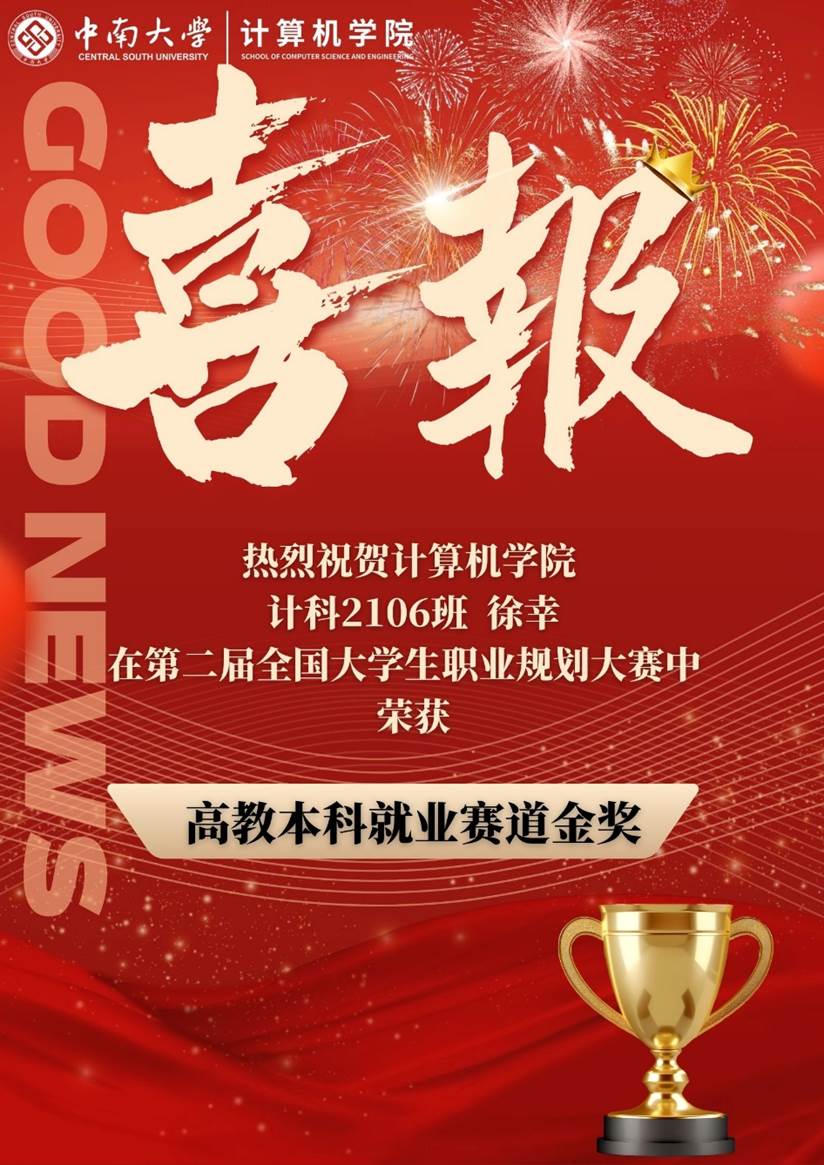 4月16日至19日,第二届全国老员工职业规划大赛总决赛在bv伟德国际1946举行。本次大赛,3名参加国赛角逐的中南学子斩获两金一银,bv伟德国际1946获特别贡献奖。其中,伟德国际VICTOR1946计科2106班徐幸同学凭借优异表现最终以本科就业赛道全国第一的成绩夺金,获高教本科就业赛道金奖!