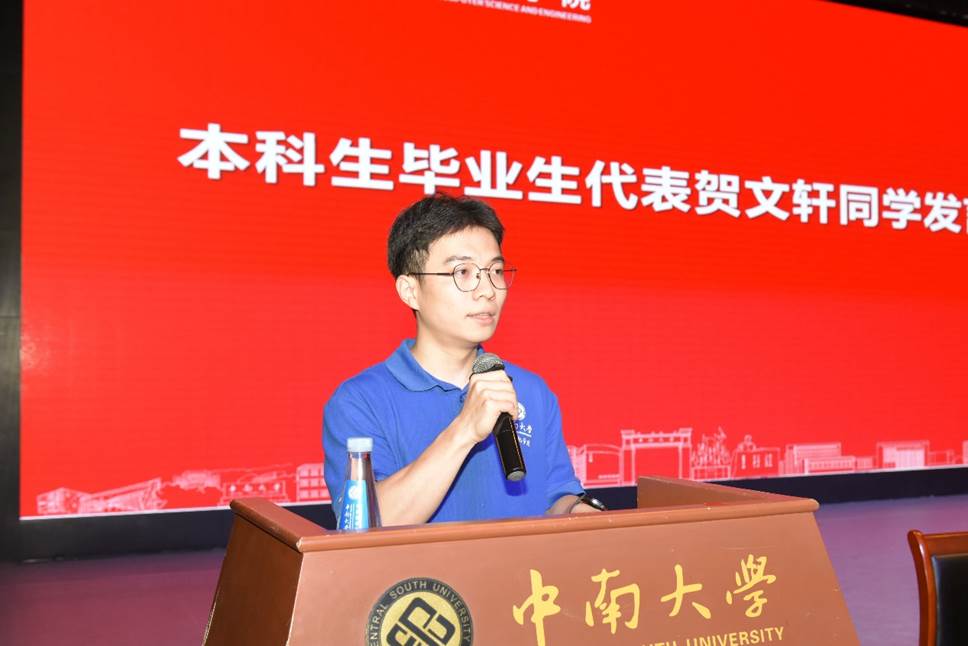毕业生代表发言环节,本科生毕业生代表贺文轩分享了自己四年求学期间的成长经历,感恩母校的悉心培育、师长的谆谆教导与同窗的携手同行,表示将带着中南赋予的智慧与力量,勇敢迎接未来挑战;研究生毕业生代表宋晓萌从自己员工和辅导员“双重身份”的独特视角,分享了“主动而为、独立思考、常怀感恩”的成长感悟。她结合辅导员工作经历,讲述了与员工朝夕相处的温暖故事,以及在育人过程中的自我成长,呼吁毕业生们以感恩之心奔赴山海,在新征程中传递温暖、照亮他人。