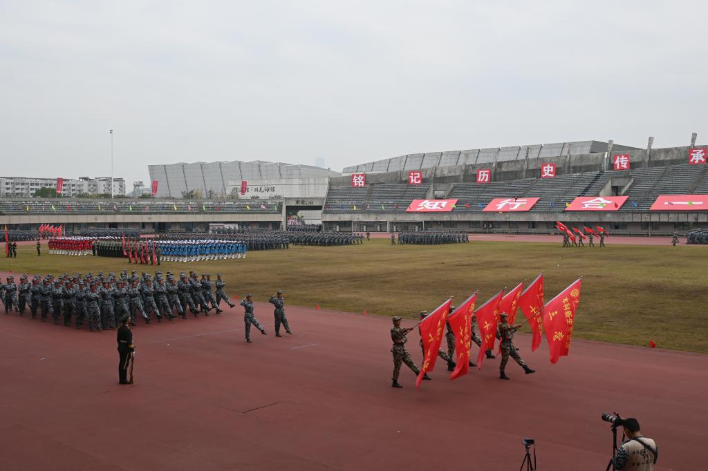 随后的分列式环节中,十一连、十二连方阵踏着激昂的乐点,步伐整齐划一。踢步有力,摆臂生风,敬礼庄重,口号震天,充分展现了新生们严明的纪律与团队精神,赢得了看台上的热烈掌声。