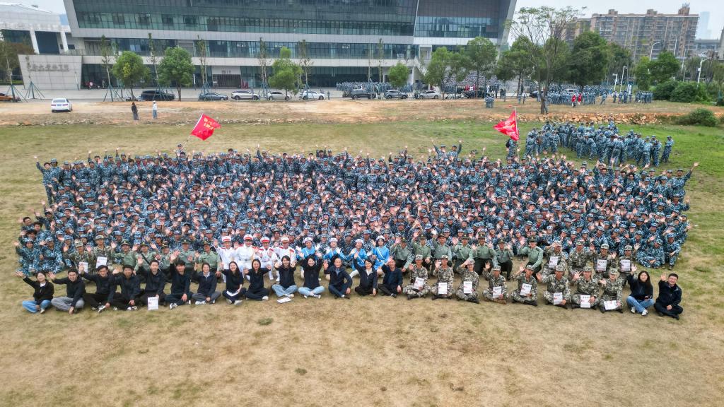 首先登场的是由三营同学组成的匕首操方阵。队员们口号响亮、动作整齐,手持匕首,挥洒自如。演至高潮,方阵迅速变换队形,以红布为墨,在绿茵场上拼写出“夺”“旗”“建”“功”四个大字,将现场气氛推向高潮,展现了计算机学子深厚的爱国情怀与昂扬斗志。
