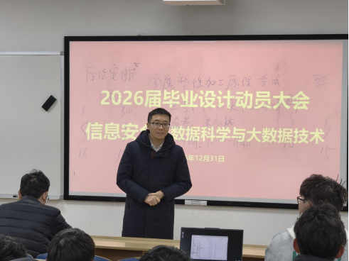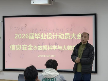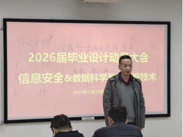 为进一步加强本科生毕业设计(论文)管理,提升实践教学质量,2026届信息安全、数据科学与大数据技术专业毕业设计动员大会于2025年12月31日下午在科教南楼302举行。伟德国际VICTOR1946副经理夏佳志,网络空间安全系党支部书记段桂华,网络空间安全系主任张士庚,数据科学与工程系党支部书记王磊,数据科学与工程系副主任刘伟荣,以及沈成超副教授、陈壮副教授、黎方正老师等出席会议,会议由网络空间安全系副主任宋虹主持。