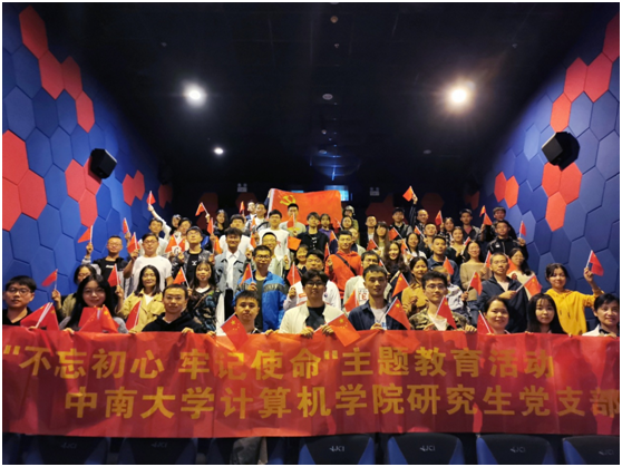 10月7日13时30分,参加观影活动的党员同志来到步步高湘核影城集中等待,党员同学们非常激动,纷纷挥舞着手中的五星红旗,高唱《歌唱祖国》《我和我的祖国》等爱国歌曲。