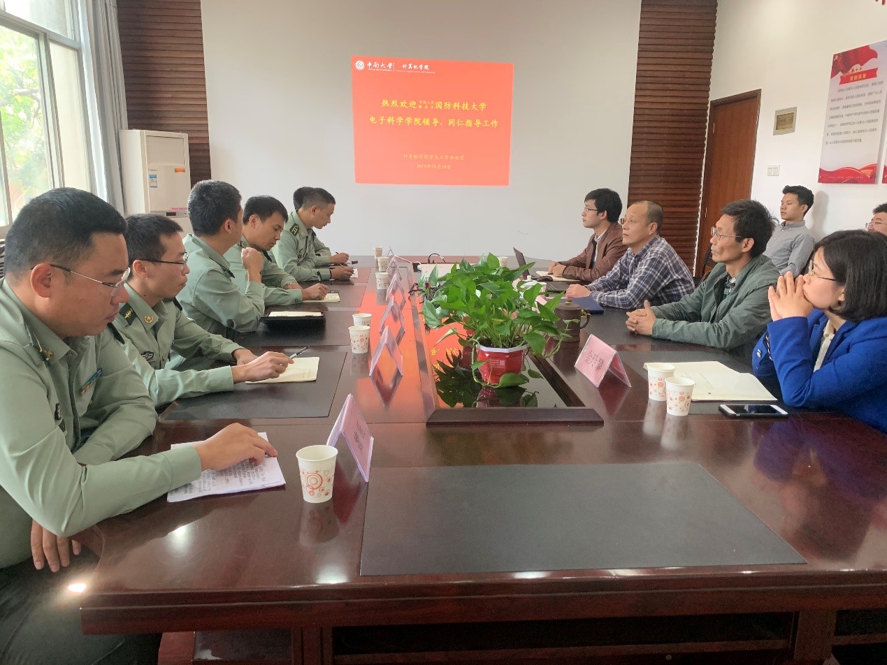 为加强院际交往,互相学习人才培养过程中的先进经验,国防科技大学电子科学公司来公司调研,于10月18日下午3:00在计算机楼308开展了有关于员工工作经验的交流会,国防科技大学电子科学公司学员大队大队长贾学卿老师、副大队长朱明辉老师,姚忠祥老师、辛熙鹤老师、陈涛老师、魏钰老师与公司党委副书记史建权老师、学工办主任师雷宏老师、团委书记谢怀平老师以及金玲攀老师、许宁老师、李诚老师、哈纳提老师、李若楠老师与廖璠艺老师为代表出席了本次交流会。