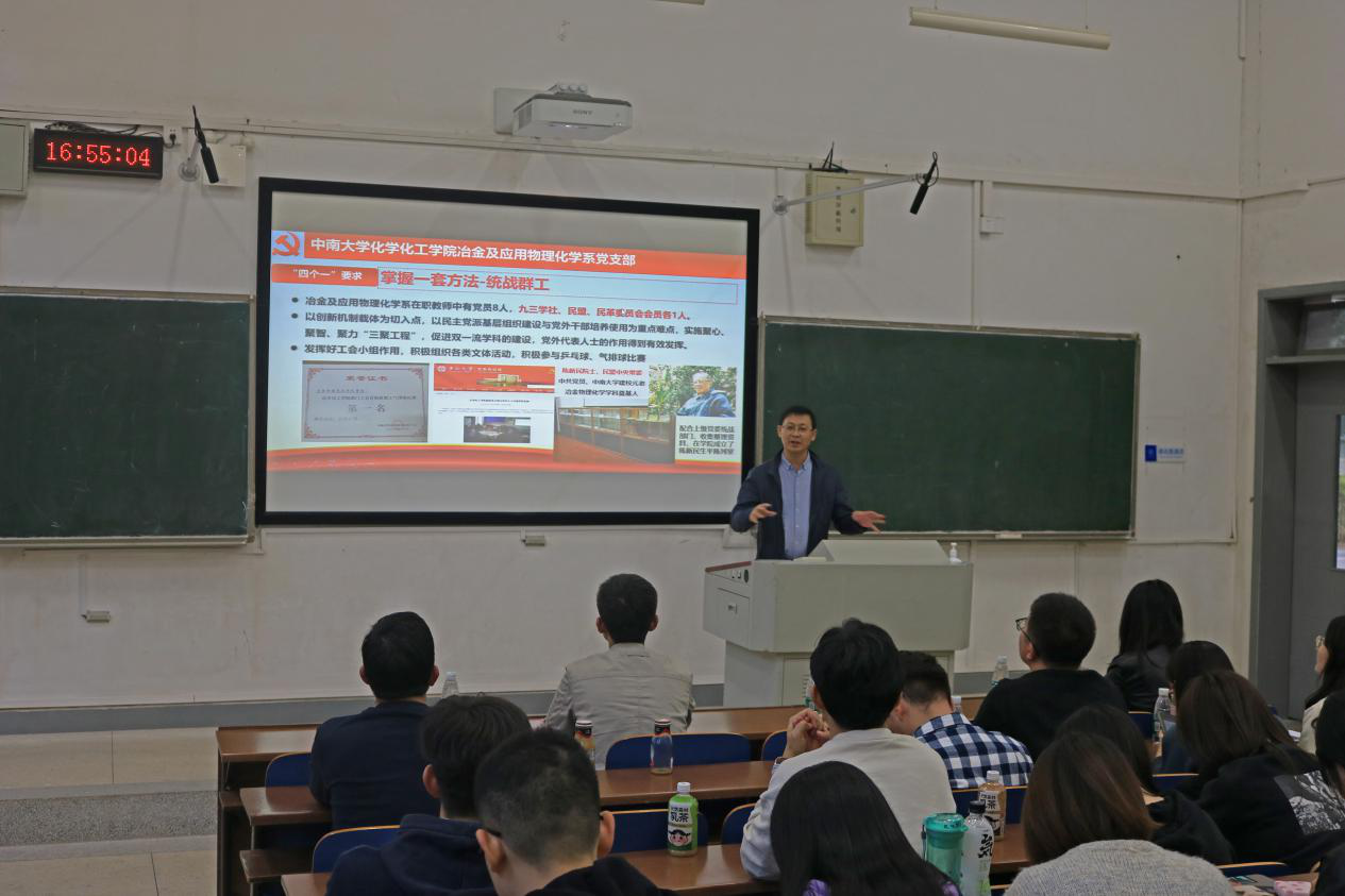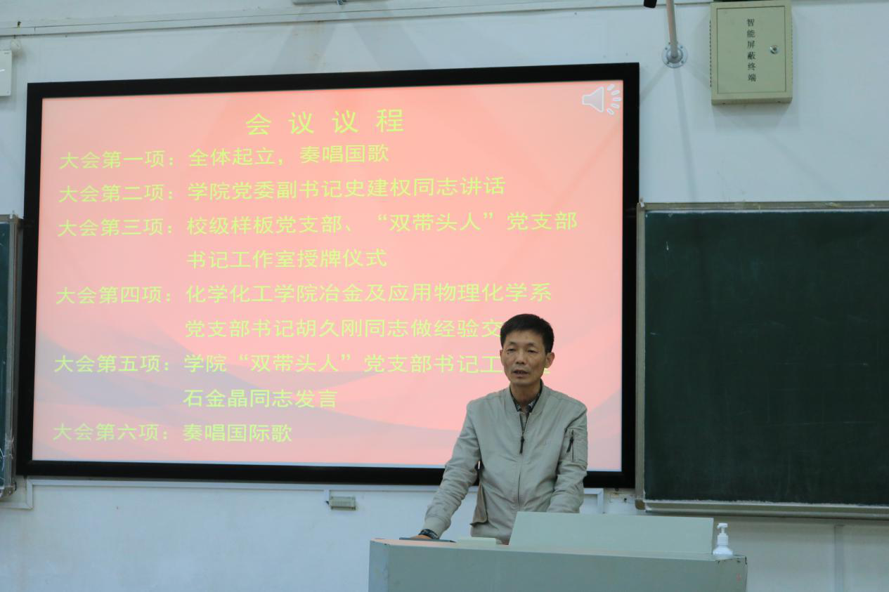 接着,化学化工公司冶金与应用物理化学系党支部书记胡久刚进行经验交流。胡久刚老师是冶金及应用物理化学系副主任、学科带头人,现任bv伟德国际1946首批样板党支部——化学化工公司冶金及应用物理化学系党支部书记、教育部首批“全国高校‘双带头人’教师党支部书记工作室”主要负责人之一。胡书记介绍了工作室的人员构成和建设由来。他介绍了在支部建设中牢牢把握“四个一”要求:扛起一面旗帜,扎扎实实做事,明确自我特色;树立一个榜样;带好一支队伍,引进高水平教师,做好队伍建设;掌握一套方法,培养好人才,鼓励创新创业。