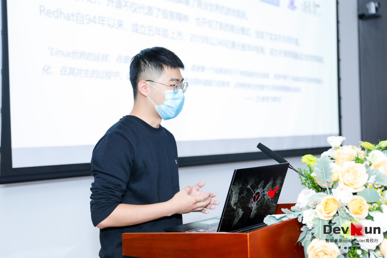 接着,麒麟软件高级研发工程师杜奕威先生从合作伙伴的角度进行了“我在openEuler成长之路”主题分享,讲述了与openEuler社区结缘,签署CLA,参与到openEuler社区的开发和维护中,并在openEuler社区中步步耕耘、逐步成长的故事。从参与者转变为分享者,他激励着在场同学参与到openEuler社区建设中。
