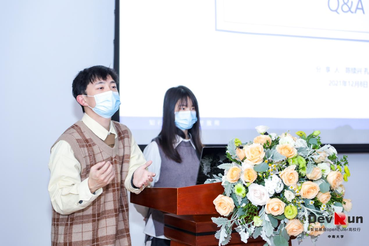 随后,公司参与开源summer活动的优秀员工代表陈续兴同学和孔克青同学做出了“openEuler 开源summer 2021参与体会”主题分享,讲述收获的故事。在当期的开源summer实践活动中他们完成了自己的项目,锻炼了项目的开发能力,更重要的是通过本次实践活动接触到了行业的前沿技术和精英,增长了专业知识的同时也开阔了技术眼界。