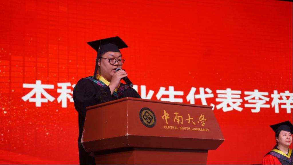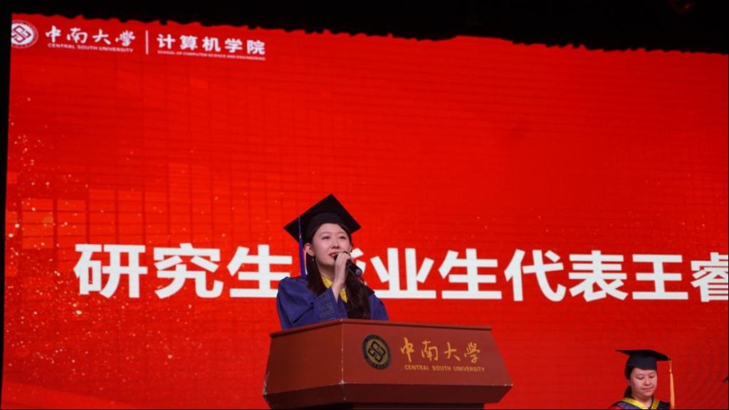 本科生毕业生代表李梓萌结合自身的学习经历,表达了对母校的感恩与不舍;研究生毕业生代表王睿卿借用“参天之木必有其根,怀山之水必有起源”感谢各位恩师的教导,并呼吁大家响应时代的号召,敢为人先,做一名专业人才。