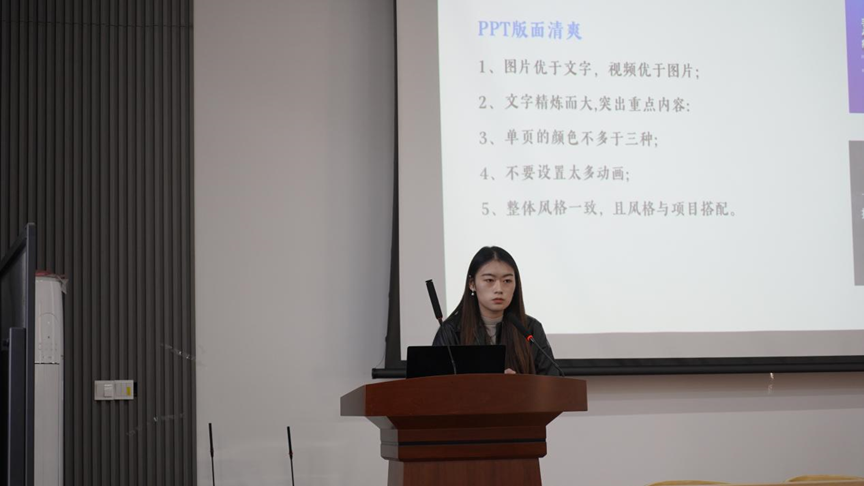 商公司的王楠同学以“通过赛道,走向旷野”为主题,分享了自己的竞赛经验。她围绕“讲好故事”,“注重实践,凸显自身工作”,“青年精神,家国情怀”三方面进行详细解读,帮助同学们理清思路的同时提供了有关选题、商业计划书、PPT制作等方面的建议,并详细介绍答辩环节准备工作,为在座同学提供了实用的参赛技巧。
