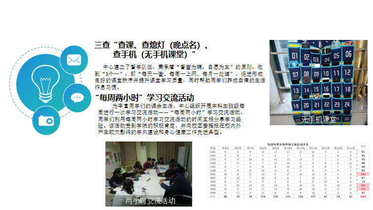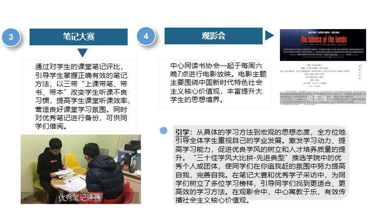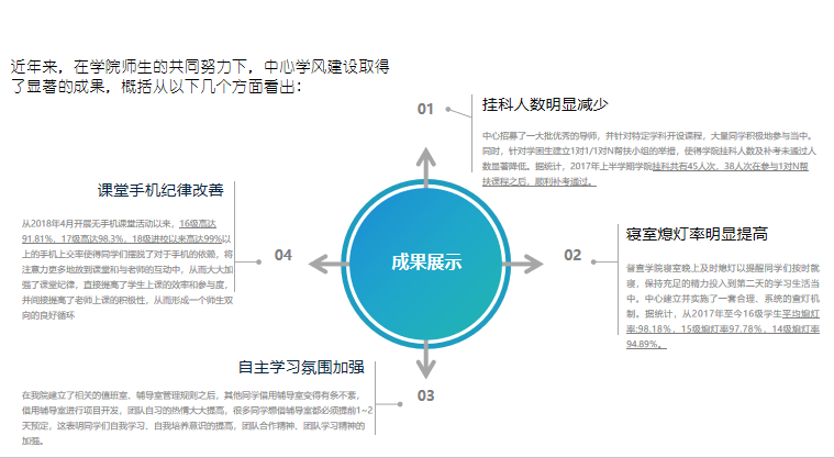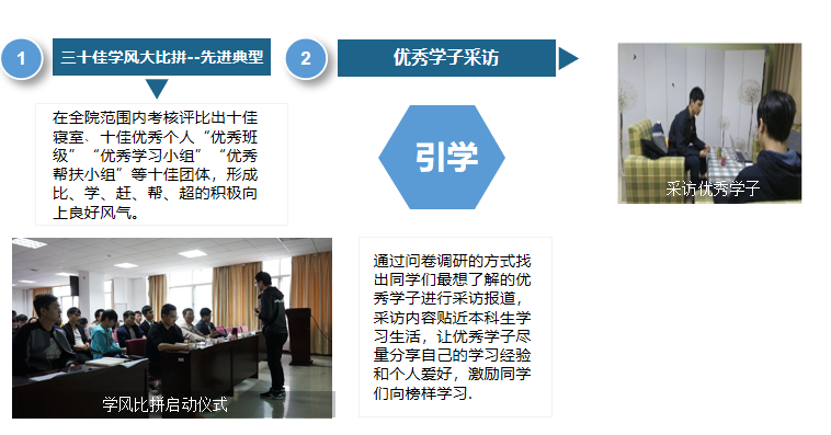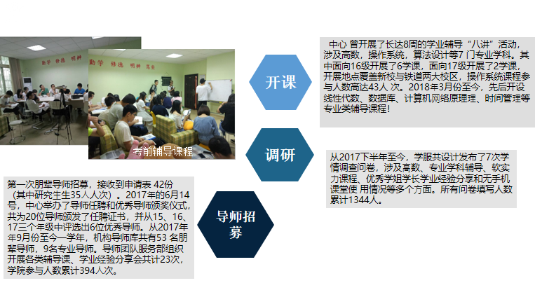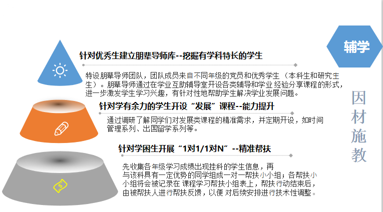 六个“三”育人与发展体系:一是建立“三个机制”,即三全育人组织管理机制、因材施教运行服务机制、多元协同保障机制;二是坚持“三个协同”,即三全育人协同、思政教育与员工学业发展协同、课内教学与课外导学协同;三是构建“三个系统”,学困生帮扶系统、优秀生发展系统、员工学业能力提升系统;四是实施“三分”模式,即分类、分层、分阶因材施教施帮模式;五是打造“三支队伍”,即朋辈导师队伍、专家教师导师队伍和成长与发展导师队伍;六是执行“三个计划”,即基础重难点课程辅导计划、诚信自律尚学计划、优良学风行动计划。