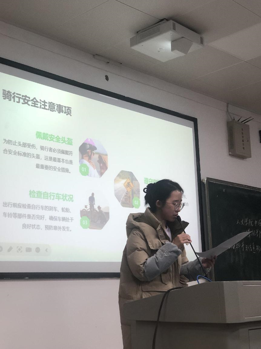 在理论学习环节,主持人带领同学们深入剖析行人与非机动车交通规则:从遵守信号到规范通行,每一个细节都关乎生命安全;全面解读骑行安全注意事项,让戴头盔、车辆检查成为守护生命的坚强盾牌;进行常见交通标志解读与知识问答竞赛,以生动有趣的方式加深大家对交通法规的理解。同学们积极参与问答,回答正确的同学还可以领取小礼品,活动氛围十分热烈。