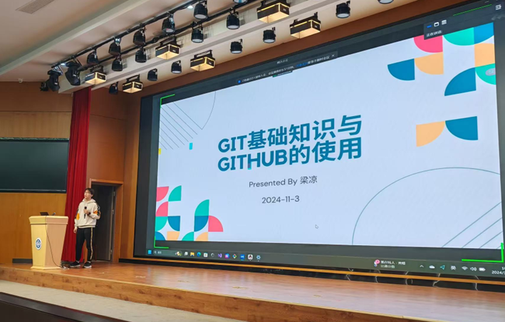 第一堂课,由梁凉同学为同学们细致介绍了Git以及GitHub的发展历史、基本功能、使用方法等多项内容,并进行了实时演示,鼓励同学们在听课中动手,取得了良好的课堂效果。