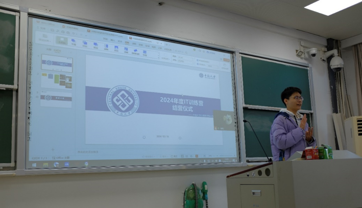 随后,科协交流部部长刘喜贺主持了2024年度IT训练营结营仪式,在仪式上,刘喜贺对本次IT训练营进行了总结,对同学们的学习态度和热情表示肯定。同时,他公布了本次IT训练营的获奖名单,并为获奖同学颁发了奖品。最后,他宣布本次结营仪式圆满结束,IT训练营活动正式收官。