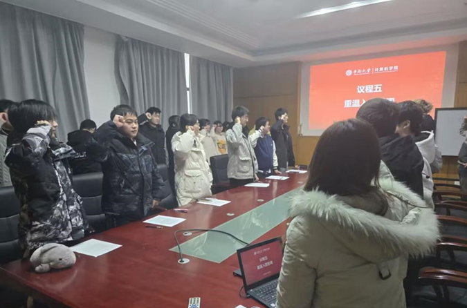 会议最后,计算机2203团支部在支部书记带领下集体起立,一同重温入团誓词,展现了青年一代为国为党砥砺前行的决心与信仰。