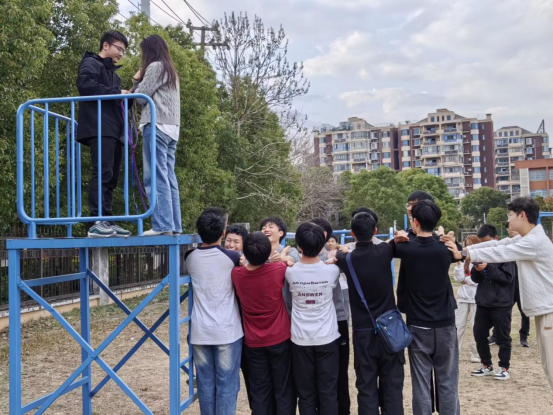 最后的“信任背摔环节中,同学们轮流从高台仰倒,由队友们用双臂搭建的“安全网”稳稳接住。随着活动推进,团队成员间的默契显著提升,动作从拘谨逐渐变得流畅自然。活动过程中,同学们依照教练的指导,始终贯彻“不抛弃、不放弃”的协作理念,切实强化了责任意识与信任纽带。