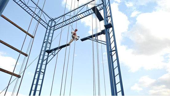 破冰环节结束后,“高空断桥”挑战正式开始。在唐教练的指导下,同学们依次登上8米高台,跨越1.2米长的断桥间隙。尽管部分同学起初略显紧张,但在队友持续的加油声中,全体成员均顺利完成挑战。同学们从最初的恐惧逐渐转变为勇敢尝试,最终收获了成功的喜悦。在这个过程中,他们不知不觉地培养了直面困难时的冷静心态和自我突破的决心与勇气。