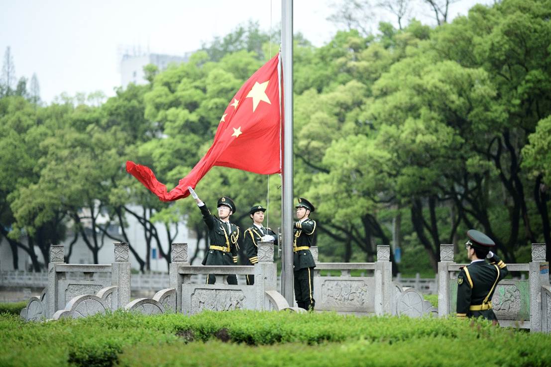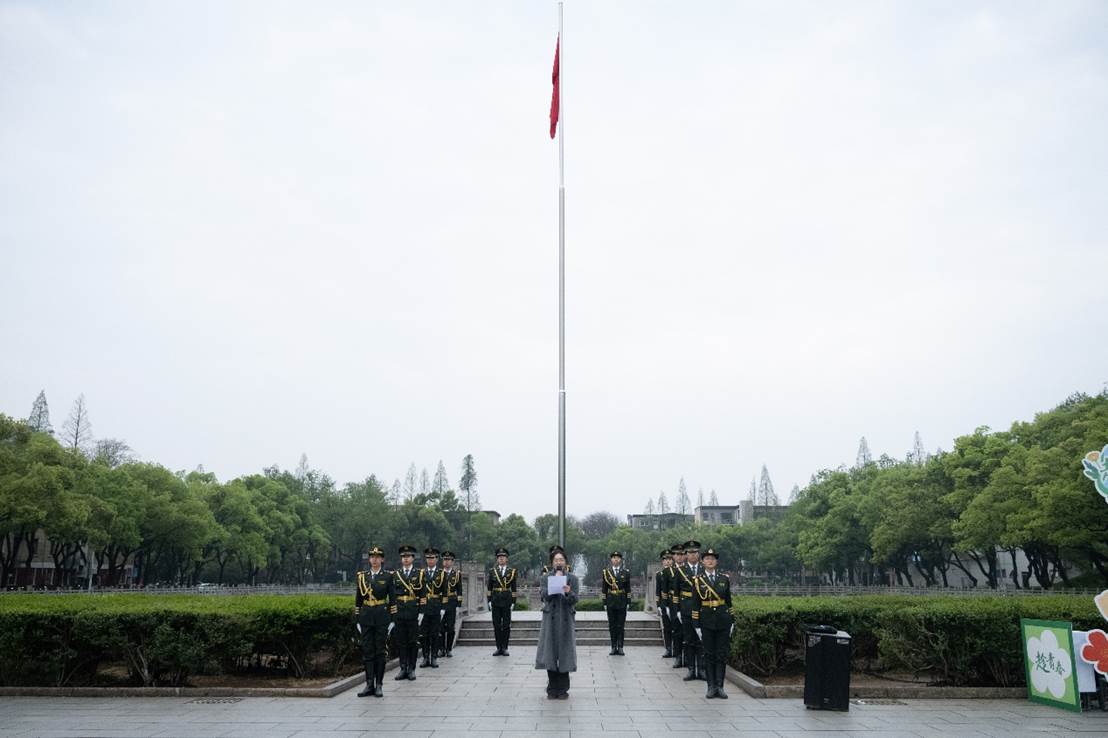 春光初现,微风轻拂。6时40分,升旗仪式正式开始,国旗班成员步伐坚定、神情肃穆,护送五星红旗至升旗台。随着旗手振臂一挥,鲜艳的五星红旗冉冉升起,迎风飘扬。