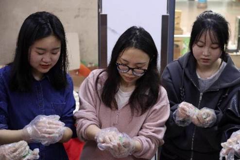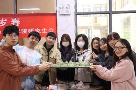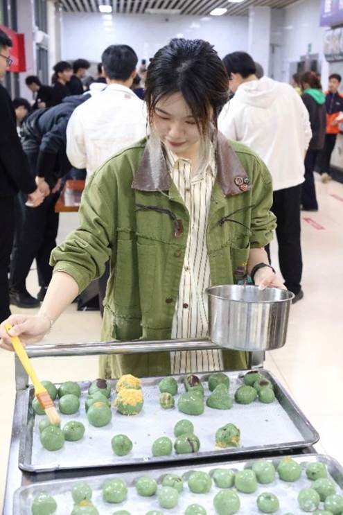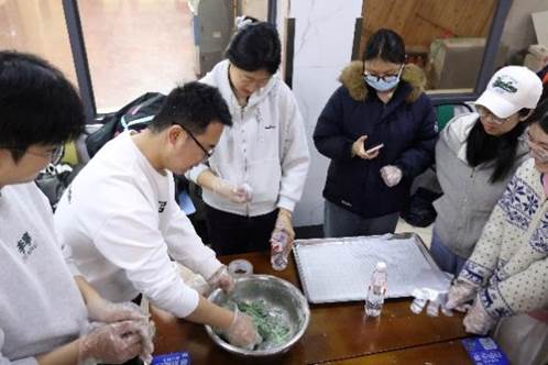 活动现场,研究生会精心准备了新鲜的艾草汁、糯米粉、馅料等食材和制作工具。同学们分成若干小组,围坐在一起,在专业师傅的指导下,开启了青团制作之旅。揉面、包馅、成型,每一个步骤大家都全神贯注。有的同学手法娴熟,不一会儿就做出了圆润饱满的青团;有的同学则是初次尝试,在制作过程中遇到了不少小问题,但在同伴的帮助和老师的指导下,也逐渐掌握了技巧。现场欢声笑语不断,大家在相互协作的劳动中增进了彼此的了解和友谊。