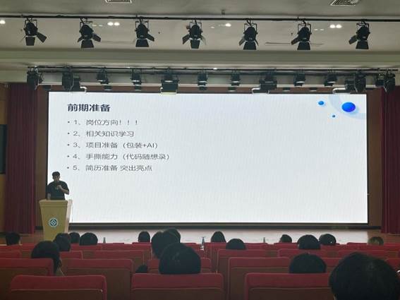 贾惠翔同学以自身投递企业的经历为演示案例,分享求职前期准备要点。他认为,想要提升求职成功率,需做好三方面准备:一是系统学习专业知识,夯实技术基础;二是梳理课程设计与实习项目经历,“包装” 项目成果,突出个人在项目中的核心作用;三是针对性润色简历,挖掘竞赛获奖、技能证书等个人亮点,同时通过多练实操提升代码能力,让简历更具竞争力。