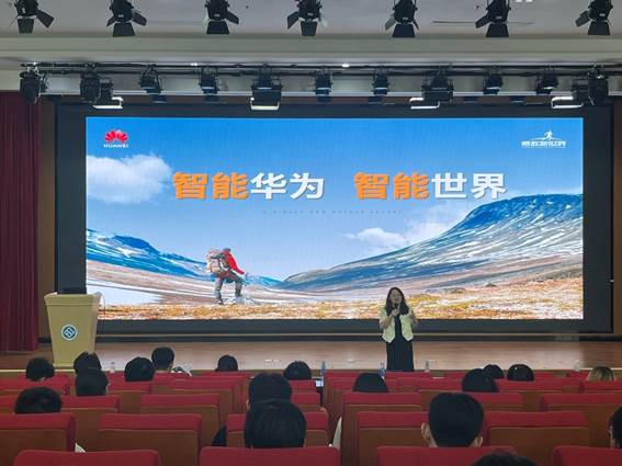 华为招聘经理赵小桃先带领同学们深入了解华为的企业精神,以及华为在5G通信、人工智能等领域的核心技术优势。随后,她邀请华为员工潘仲傅(软件工程19届毕业生)上台,从员工视角分享入职后的成长经历:他详细介绍了入职以来参与的重点项目、日常工作内容,以及在导师指导与团队协作中获得的技术提升和职业素养成长,真实的经历让同学们快速产生共鸣,对华为的工作模式与职业发展路径有了更直观的认知。