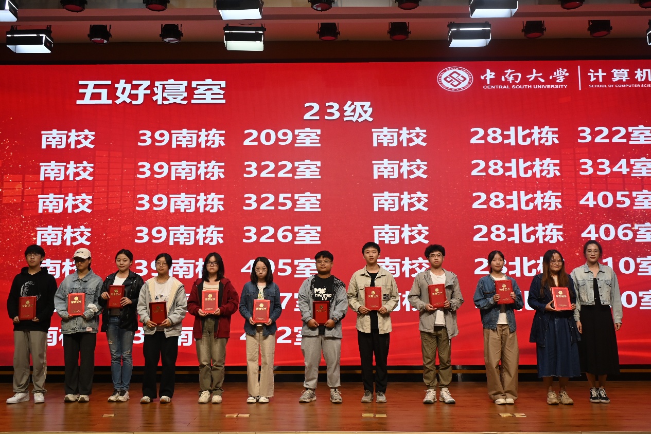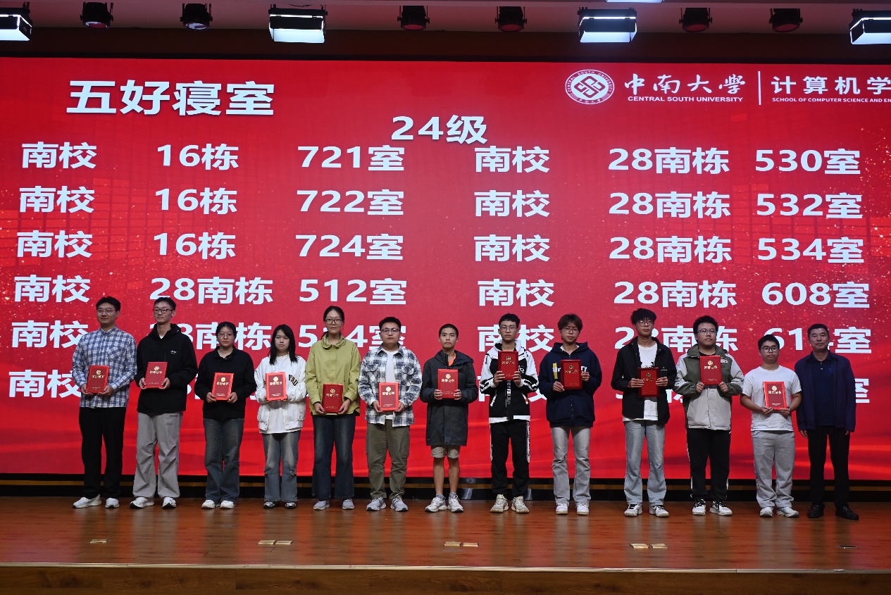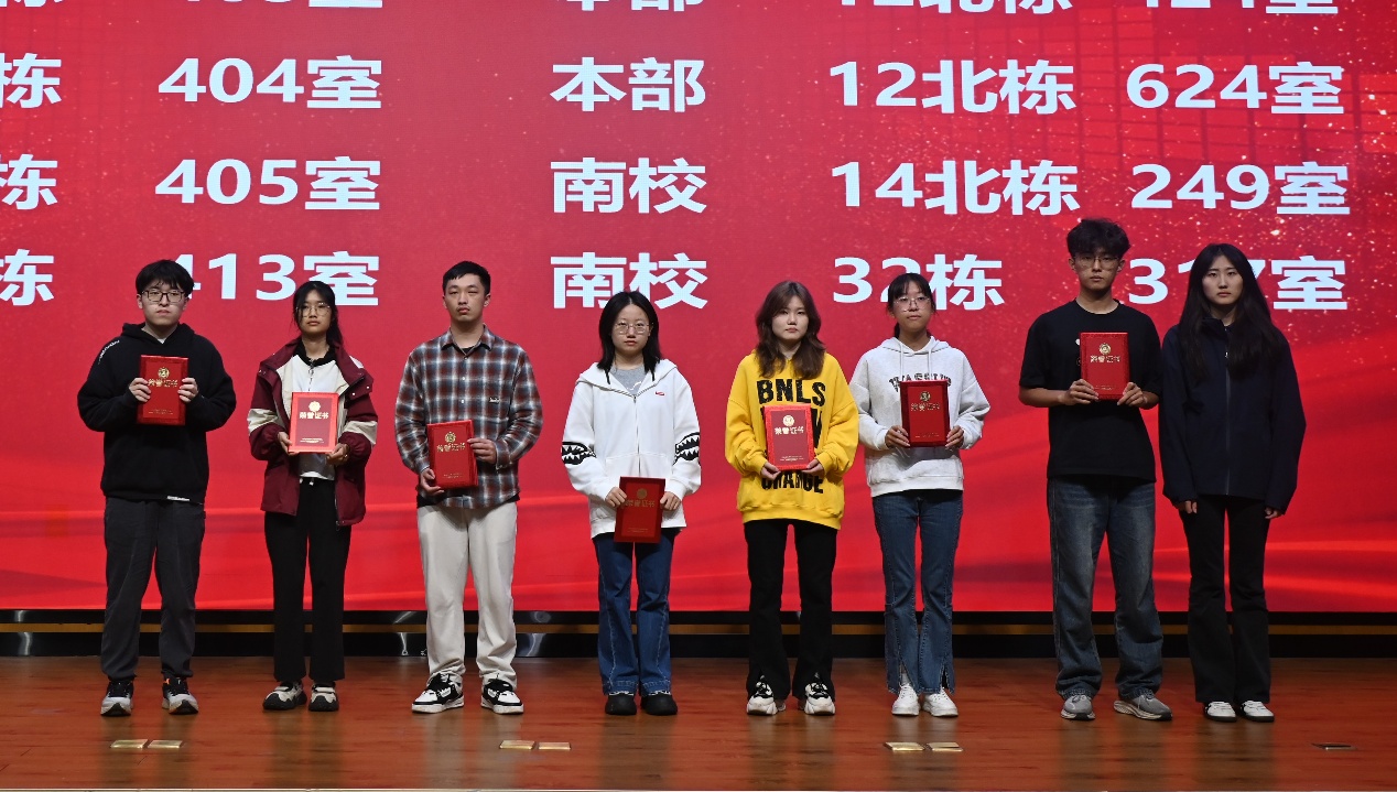 在表彰环节,大会对前期评选出的“五好寝室”及优秀个人进行隆重表彰,参会领导老师分别为获奖寝室代表颁发荣誉证书及奖品,并合影留念。