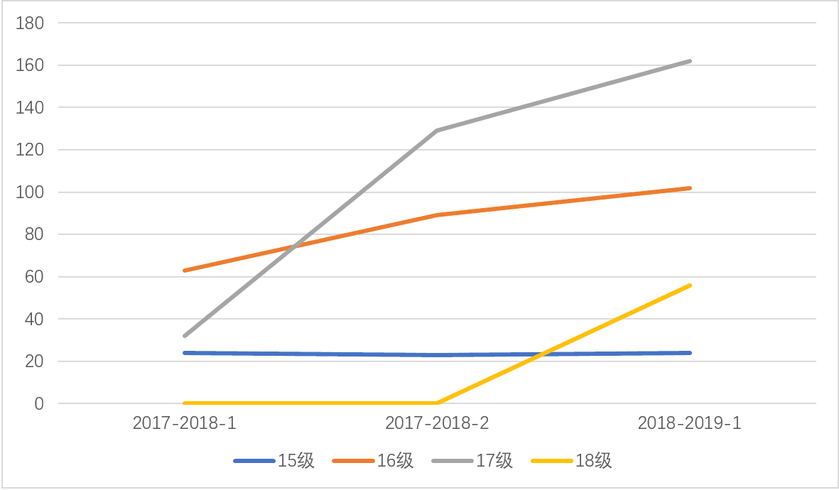 17级同学们在刚入学时仍保持着饱满的学习热情,但是随着时间的推移,大家的学习热情极具下降,挂科率剧增,希望同学们能够及时调整时间安排,把学习放在第一位。16级同学挂科率有所增长,一位同学挂科多门的现象出现较多,希望这些同学多加努力弥补差距。15级同学挂科率一直保持低水平,希望继续保持。18级同学挂科普遍集中在高数,同学们在下学期要多将注意力放在高数这类公共课上,避免重蹈覆辙,但是同学们仍要保持信心,相信璀璨的未来就在不远处。