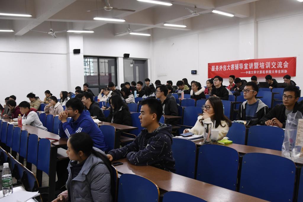 然后任胜兵老师由参加服务外包大赛的益处入手,用幽默诙谐的叙述方式给予了大家深刻的启示——我们的思维不能仅限于眼前的竞赛奖励与推免加分,更要认识到参加比赛对个人实践能力的巨大提升。任老师在向同学们简要地介绍了比赛的参加方式之后,又从队长行为 ,推销能力和知识投入三个方面细致入微地传授了比赛取胜的诀窍。最后他提醒大家要注意提前做好课题调研,研究公司喜好,同时确保项目数据的真实性,现场掌声雷动,气氛十分热烈。