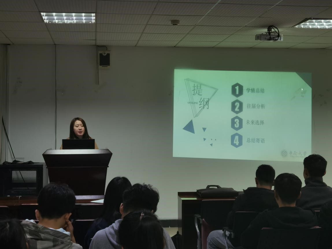 首先,由王睿卿老师介绍了到场的老师和学长,对大家的到来表示热烈欢迎,后宣布年级大会开始。王睿卿老师先分析了大三上学情总结,包括挂科情况、学分情况,总结了当下本年级员工存在的问题并给出建议。为了让同学们对未来考研、就业等各方向的整体情况有更清晰的了解,王睿卿老师紧接着进行了往届就业去向分析,对软件工程专业2016级和2017级的保研、考研、就业等情况进行了分析。分析之后,王睿卿老师便总结了当下同学们面对未来选择时需要考虑的事情,要明确自身定位,明白自身需求,明晰如何去做,并对互联网岗位需求等就业基础知识进行了讲解。