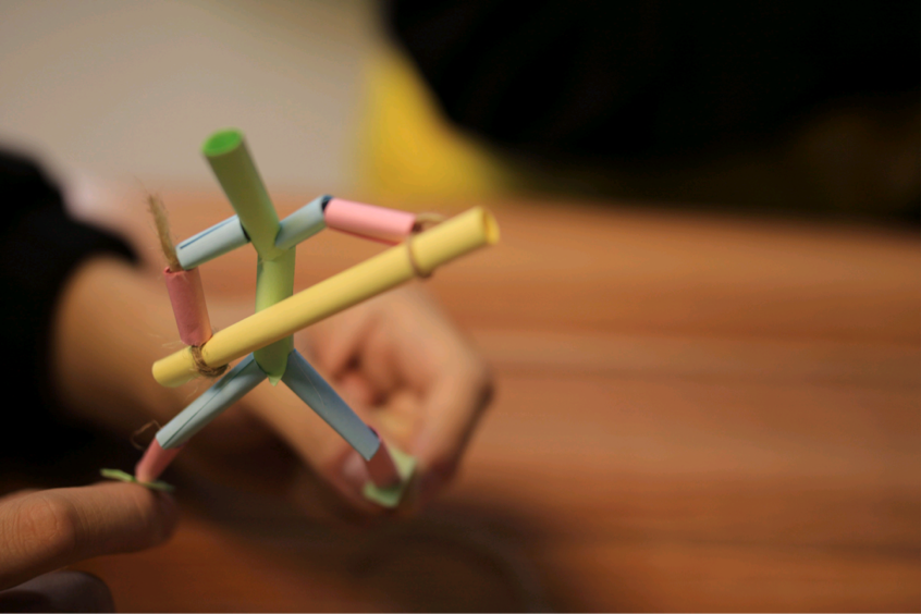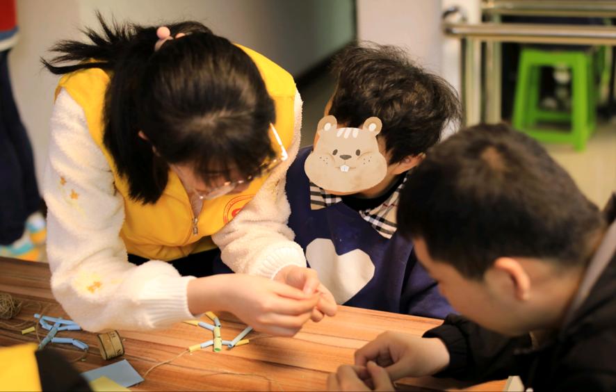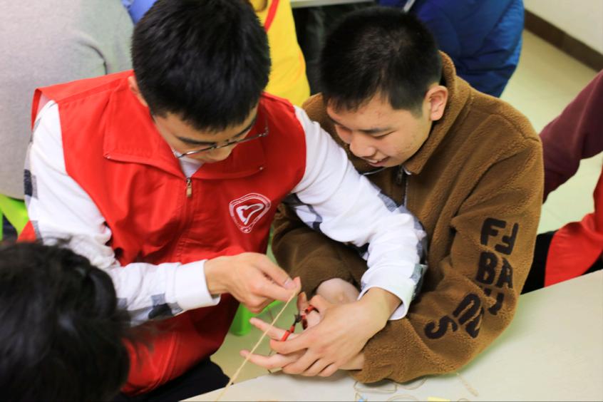 接着,所有人被分为五组进行活动——制作竹节人和风车。开始之前,大家先进行自我介绍、聊天交流,这拉近了志愿者和特殊群体的距离。工作人员分发完提前准备的材料,并在事先培训过的志愿者的指导帮助下,各组成员开始一点点地制作手工。所有人热情亲切的笑容,偶然发生的温馨瞬间,简简单单的交流互动,一切都如蒸气腾腾的一列火车缓缓行驶在既定轨道上,虽是一个平顺而简单的过程,空气却是暖暖的,愉悦的,充实的。制作完毕,由各组成员上前展示成果。他们虽然身体有缺陷,但是动手能力不差,有的成果还具有独特的创造想法。展示中,大家都收到了不绝的赞许和热烈的掌声。