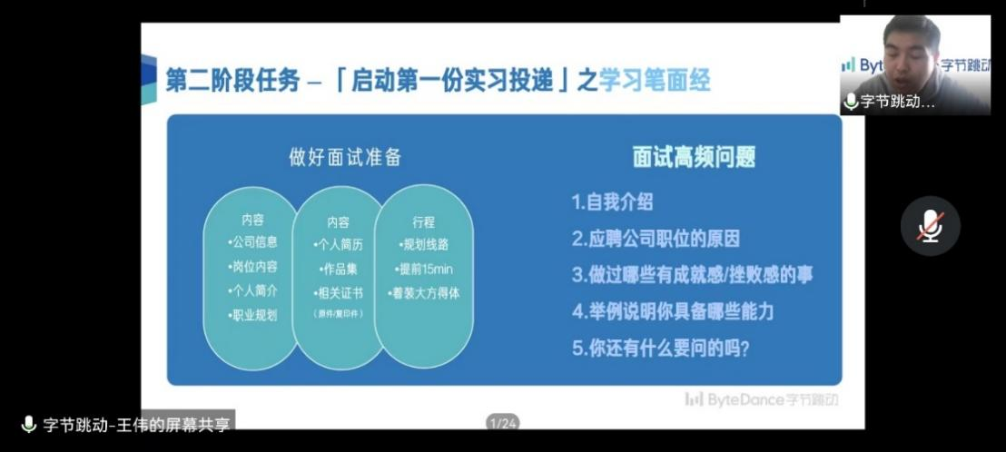 本次会议由伟德国际VICTOR194620级研究生辅导员刘逸峰老师主持,并邀请字节跳动资深HR王经理为同学们做出指导。