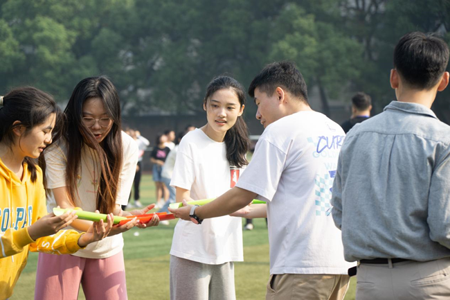 首先进行的比赛项目是团体比赛“推舞双球”、“珠行万里”和部分径赛。绿茵球场上,成对的排球在“推舞双球”运动员们手下奋勇向前,轻盈的乒乓球在“珠行万里”参赛者们管中一路争先。老师们也组成了一支队伍参加“珠行万里”项目,与同学们一起享受运动之乐。