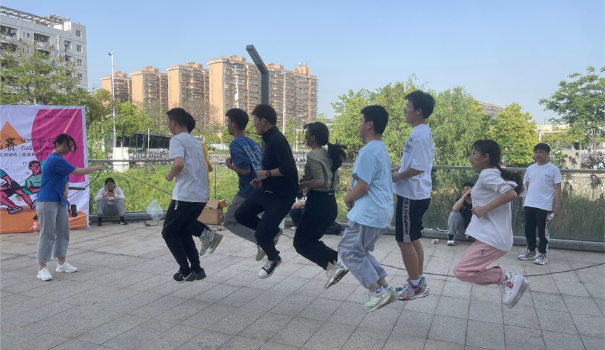 在活动现场,甩绳的同学分别拿起了手中的跳绳,开始了激烈的比赛。同学们在场地上展示出了各自的绝技和特长,有的选手用轻盈的步伐跳起高难度动作,有的选手则通过快速的节奏展现了出色的跳绳技巧,矫健的身姿是青春与活力的映现。活动现场气氛可谓相当热烈。