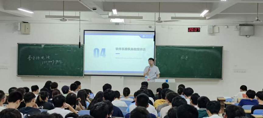 大会第三项,软件系唐枫枭教授对实训内容及要求展开具体说明。唐教授首先向同学们介绍了实训项目的具体要求并解释了相关评分细则,然后介绍了开发项目所需要用到的专业知识以及相关平台,最后强调了“成果展示能力”的重要性,不仅要会做,而且要会说。同学们在唐教授的介绍下对于实训相关的技术要求和项目需求有了更加深入的了解,明晰了目标与方向。