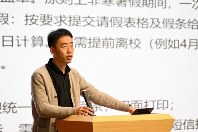 大会第四项,20级优秀员工代表吴嘉臻同学发言。吴同学就自身的情况对就业这一发展方向进行了经验分享。他从大学理想、学习能力和目标以及课外生活三个方面进行了较为详细的阐述。期间,吴学长一直强调自身目标和能力相协调的重要性,并提醒同学们一定要朝着确定的方向努力提升自己,不可顾此失彼。最后,吴嘉臻学长希望同学们不要当语言的巨人,行动的矮子,一定要付诸行动。
