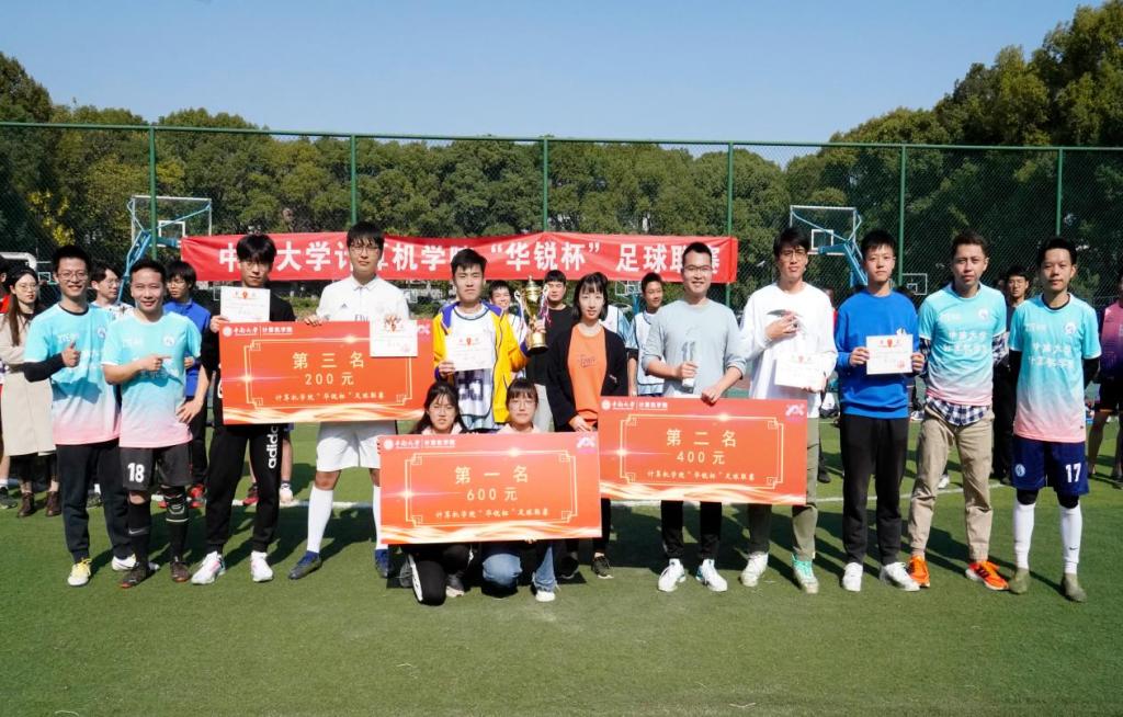 最后是激动人心的颁奖时刻。十一点半的绿茵场上,颁奖典礼已准备就绪。老师们和华锐金融的陈经理亲自为每位获得名次的球员颁奖,球员们双手接过奖状,向老师们和经理鞠躬致意。第一名的队伍是期末考试全队(计科2004与软工2002联队),第二名是406A实验室队,第三名是桥洞底下盖小被儿队(通信1901,1902,软工2002联队),第4、5、6名分别是啊对对队(软工2103)、你说的都队(计算机类2110,2113联队)以及计科0105银河舰队(计科2001,2005联队)。