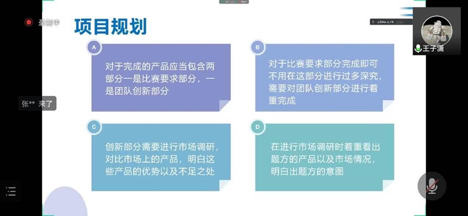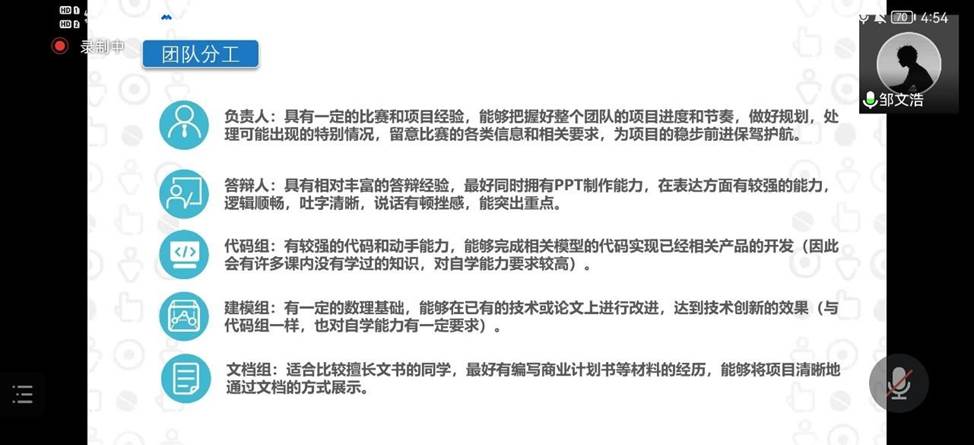 接下来为获奖团队代表的经验分享环节。服创特战队的王子潇首先进行分享。他详细地讲解了服创比赛的具体流程,并结合自己团队曾经遇到的问题,详细阐述了项目各个细节问题,分享有的放矢,让同学们深入了解了项目背后的各项工作。