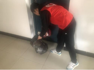 志愿者清理宿舍门前的垃圾袋