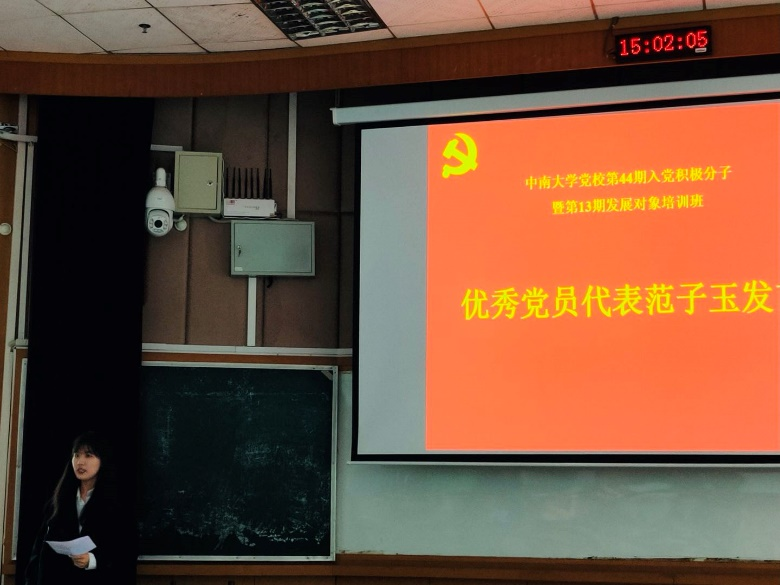 仪式进行第四项:优秀党员代表范子玉发言。范子玉同志对培训班的学员表达了由衷的期望:成为一名光荣的共产党员,不是通过一两次培训就能办到的,需要的更是长期的不懈努力。“入党是一辈子的事” ,希望我们这一代人能够接好接力棒。